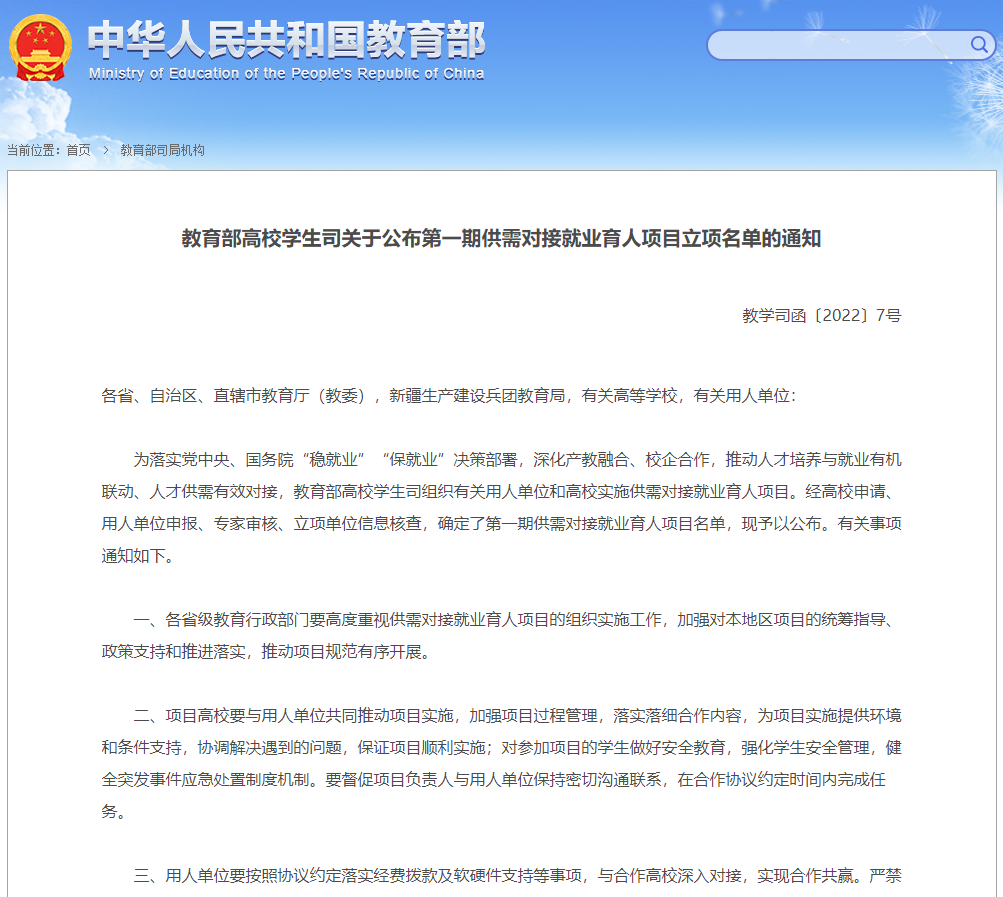 近日,教育部发布《教育部高校学生司关于公布第一期供需对接就业育人项目立项名单的通知》(教学司函〔2022〕7号),确定了第一期供需对接就业育人项目名单,并予以公布,星空分别与北京华航唯实机器人科技股份有限公司和赛云九洲科技股份有限公司对接的两个就业育人项目成功入围。