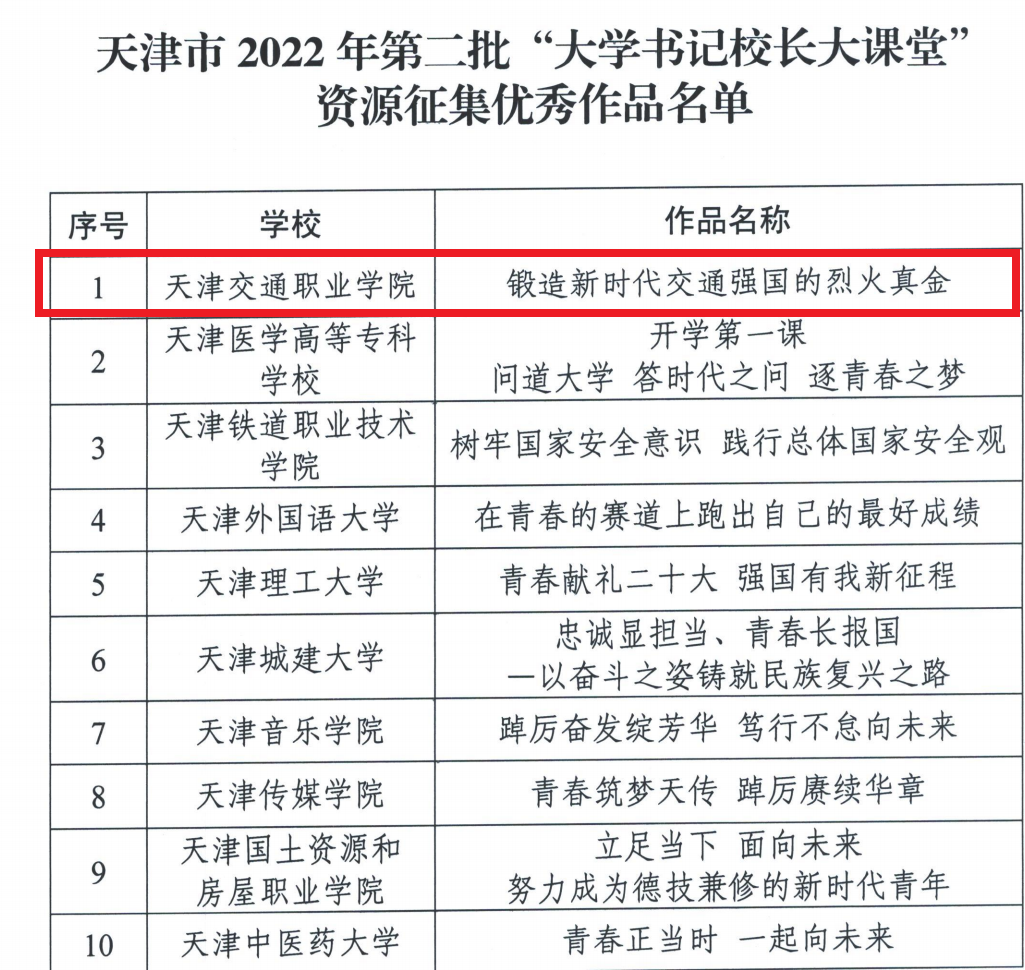 为全面落实立德树人根本任务,推进新时代高等教育高质量发展,深入实施“大学书记校长大课堂”专项,根据教育部相关工作安排,天津市在首批资源征集基础上,启动“大学书记校长大课堂”第二批资源征集工作,共收到作品24份。经由相关专家进行评审,遵循公平、公正、公开的原则,10份作品被评为优秀作品,并推荐参加教育部征集工作。