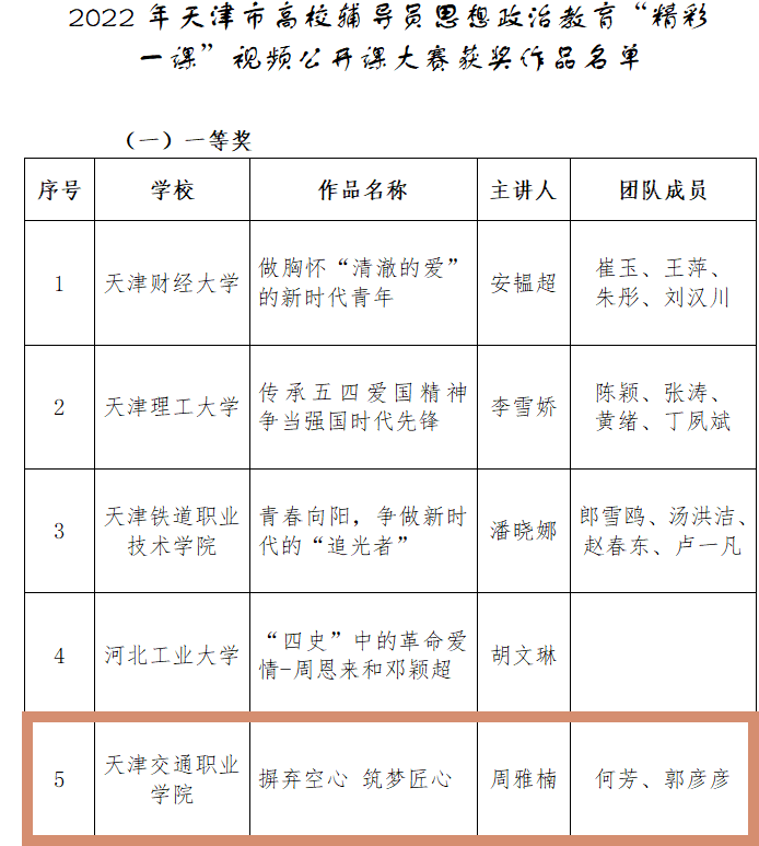 近日,天津市委教育工委、市教委发布《关于公布2022年天津市高校辅导员思想政治教育“精彩一课”视频公开课大赛获奖作品及优秀组织单位的通知》,由星空周雅楠老师主讲,何芳 郭彦彦老师作为团队成员报送的参赛作品《摒弃空心 筑梦匠心》荣获大赛一等奖,为学院争得荣誉!