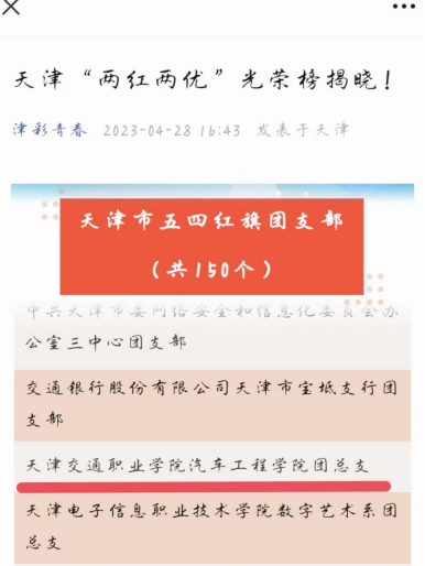 近日,由共青团天津市委主办的“两红两优”光荣榜揭晓啦!汽车工程学院团总支荣获“天津市五四红旗团支部”荣誉称号。