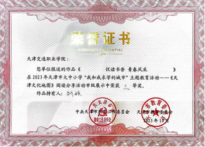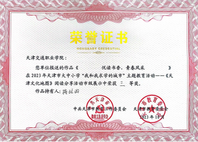 2023年10月26日,2023年天津市大中小学“我和我求学的城市”主题教育活动——《天津文化地图》阅读分享活动市级展示活动在天津外国语大学举行,星空路桥工程学院蒋玲昀、刘硕两名同学以82.6分和82分的优异成绩荣获三等奖。