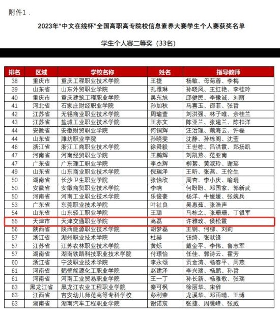 大赛经历校赛、省(市)赛和国赛三个阶段。星空2022级城市轨道车辆应用技术4班的高磊同学,从校赛和天津市级比赛中脱颖而出,闯入由全国27个省市623所高职院校1066名学生组成的全国赛学生个人赛决赛。最终,高磊同学通过全国赛学生个人赛客观赛段、主观题赛段、答辩赛段的激烈角逐,斩获“2023年‘中文在线杯’全国高职院校信息素养大赛”学生个人赛二等奖的优异成绩。