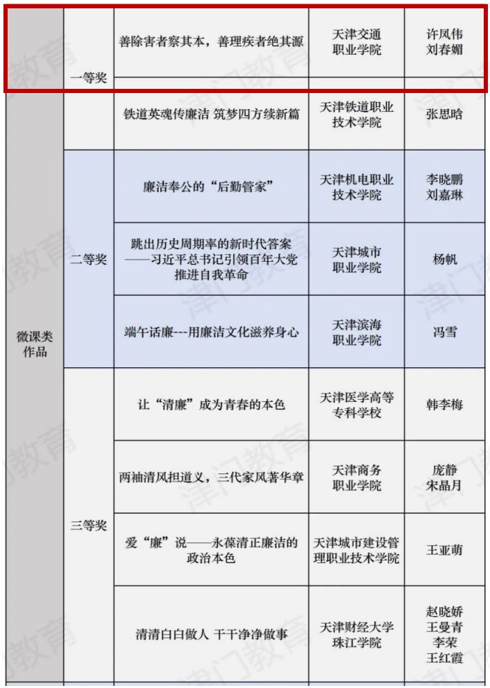 近日,由市教育两委主办的“廉洁铸魂强根本挺膺奋进建新功”第九届天津高校廉洁教育系列活动成功举办。活动以面向全市高校征集廉洁教育主题相关作品及课堂实际案例为主要内容,市教育两委组织46所高校宣传思想工作部门主要负责同志对所有入围作品进行了评审打分,最终按照征文类作品、视频类作品、创意类作品、微课类作品及课堂实践案例五类,评选出获奖作品一等奖17项、二等奖31项、三等奖48项。其中,星空思政部教师许凤伟、刘春媚老师的作品《善除害者察其本善理疾者绝其源》荣获微课类作品一等奖,并推荐至教育部展播。