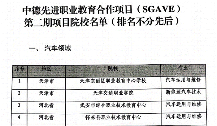 中德先进职业教育合作项目(Sino-German Advanced Vocational Education,简称SGAVE项目)成立于2011年,是由教育部牵头,德国5家汽车制造商、同济大学、德国国际合作机构和25家项目合作院校共同参与的中德国际合作项目。2020年,中德先进职业教育合作项目进入新阶段,致力于向更专业方向横向移植和向中高本贯通模式纵向拓展,2023年10月(外办[2023]437号),印发《关于中德高等职业教育合作项目二期遴选工作的通知》,推动中德先进职业教育人才培养体系在全国范围内进行辐射带动和推广。