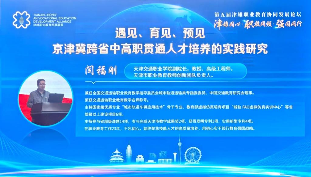 论坛由理事长单位天津职业大学校长做工作汇报,邀请了南开大学京津冀协同发展研究院秘书长张贵教授,天津市教科院职业教育研究中心主任耿洁研究员和天津职业大学职业教育研究所所长邹吉权教授等专家进行主旨报告。闫福刚副院长与雄安新区职业技术教育中心进行校校合作签约,并将行业优势助力跨省域中高职贯通人才培养路径的实践研究做以经验分享。