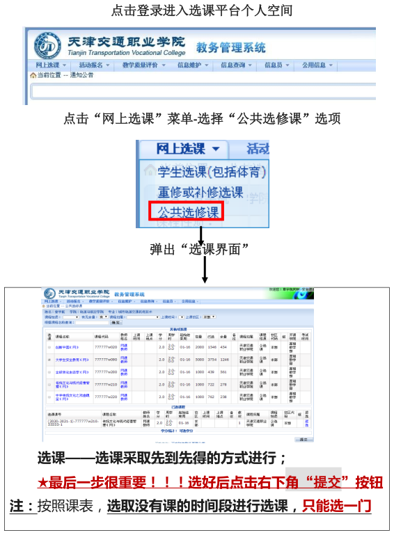 首先进入http://www.tjtvc.com/(学院网站)——右下角快速通道中的“教务在选”——输入学号和密码(初始密码是学号,建议进入后修改)