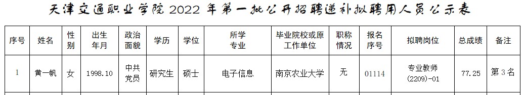 星空综合官网2022年第一批公开招聘共计13人,分别是辅导员岗(含少数民族辅导员)7人、法务管理岗1人、专职心理教师岗1人、体育教师岗1人、汽车工程学院专业教师岗2人、物流工程学院专业教师岗1人。2023年3月28日—2023年4月6日,已完成12名拟聘用人员公示。因考察阶段汽车工程学院专业教师岗第2名自愿放弃,按照《星空综合官网2022年第一批公开招聘工作人员实施方案》,依据应聘者考试成绩,由第3名予以递补。按照《市委组织部市人力社保局关于进一步完善事业单位公开招聘工作的通知》(津人社局发〔2017〕37号)要求,现将2022年第一批公开招聘递补拟聘用人员予以公示。
