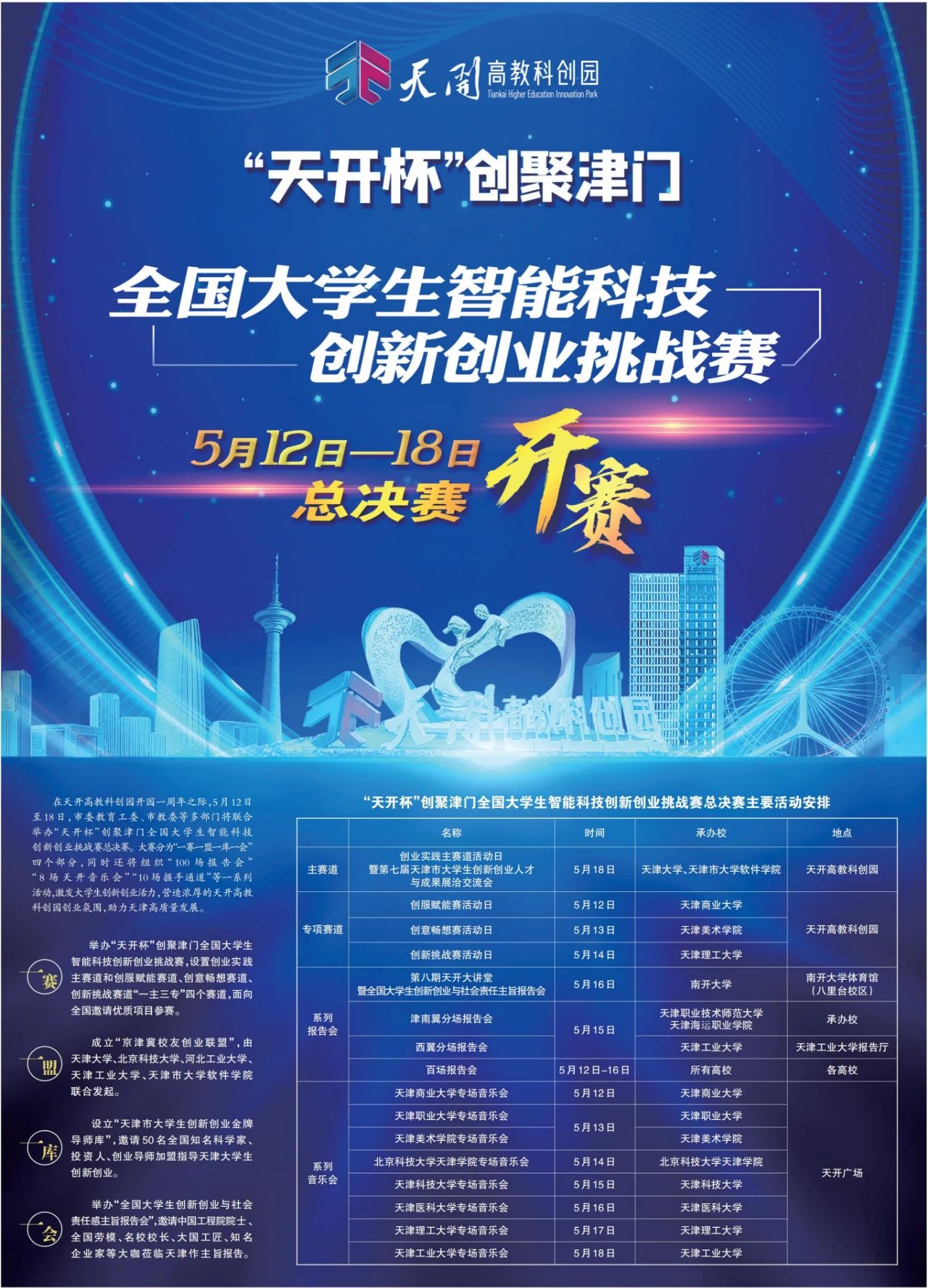 在天开高教科创园开园一周年之际,5月12日至18日,市委教育工委、市教委等多部门将联合举办“天开杯”创聚津门全国大学生智能科技创新创业挑战赛总决赛。